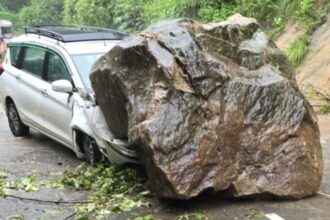 पहाड़ी से गिरा बोल्डर, कार चपेट में आने से क्षतिग्रस्त