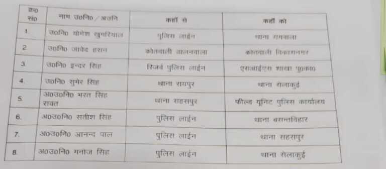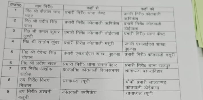 *दिनांक 5/10/2025 को वरिष्ठ पुलिस अधीक्षक देहरादून द्वारा निम्न निरीक्षकों/उप निरीक्षकों के स्थानांतरण उनके नाम के सम्मुख अंकित स्थानों पर किये गए।*