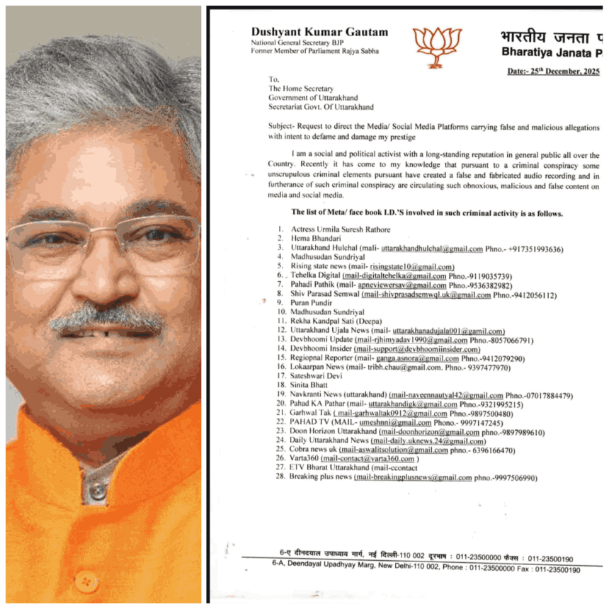भाजपा के राष्ट्रीय महामंत्री और उत्तराखंड प्रभारी दुष्यंत गौतम ने गृह सचिव को पत्र लिखकर सोशल मीडिया पर उनके खिलाफ चलाए जा रहे भ्रामक अभियान के खिलाफ सख्त कार्रवाई की मांग की है।