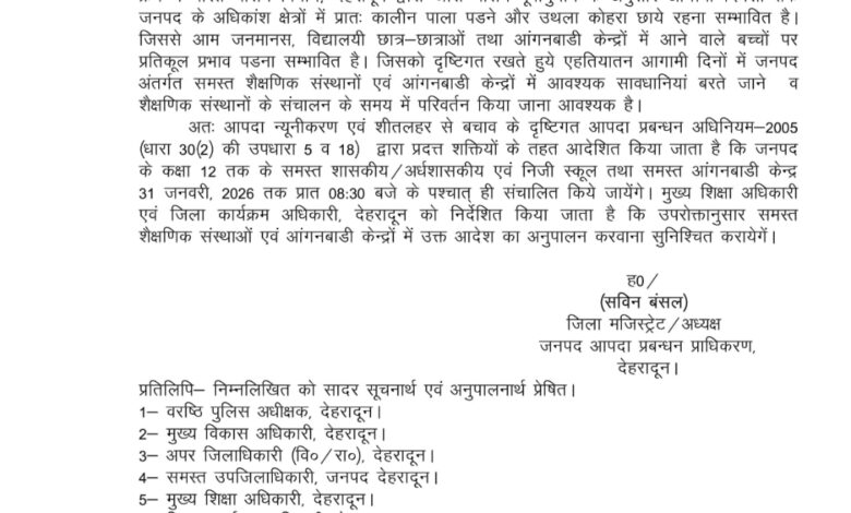 इधर, बढ़ती ठंड और पाले को देखते हुए प्रशासन ने एहतियाती कदम उठाए हैं। देहरादून जिलाधिकारी सविन बंसल ने स्कूलों के समय में बदलाव के आदेश जारी किए हैं। आदेश के अनुसार कक्षा 1 से 12वीं तक के सभी स्कूलों और आंगनबाड़ी केंद्रों में 31 जनवरी तक कक्षाएं सुबह 8:30 बजे के बाद ही शुरू होंगी, ताकि बच्चों को ठंड से बचाया जा सके।